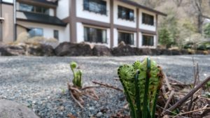 今年は例年になく暖かい日が続いていた為、もう環湖荘の前ではコゴミ等の山菜が芽を出し始めました。